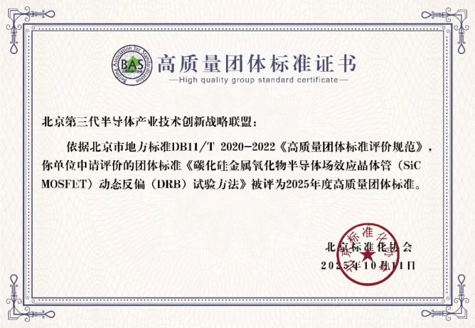 第三代半導體產(chǎn)業(yè)技術創(chuàng)新戰(zhàn)略聯(lián)盟發(fā)布的T/CASAS 046—2024《碳化硅金屬氧化物半導體場效應晶體管(SiC MOSFET)動態(tài)反偏(DRB)試驗方法》團體標準,被評為2025年度高質(zhì)量團體標準。
